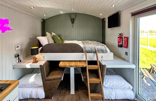Shower room: With shower cubicle and toilet.. LPG gas central heating, gas, electricity, bed linen, towels and Wi-Fi included. Front garden with firepit and garden furniture. Private parking for 2 cars. No smoking or e-cigarettes. . This superb, handcrafted shepherd’s hut can be found in the village of Singleton, nestled near the picturesque town of Poulton-Le-Fylde. Designed to accommodate two adults and two children, it makes an ideal base for couples and small families seeking a unique getaway near the beautiful Fylde Coast. The Stags Head has been a labour of love, boasting rustic-chic décor and has been meticulously crafted with careful thought to attention and detail. Once inside you’ll be greeted by a charming interior, complete with a comfortable, raised, king size bed for the adults. Two small singles are at floor level cleverly tucked underneath the dining arrangement just perfect for little ones. During the day all beds can be hidden away leaving diner style seating for meals, games and simply spending quality time.