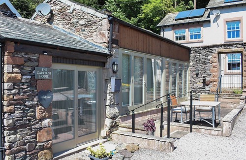 Bedroom: Galleried, Double (4ft 6in) Bed. Oil central heating, electricity, bed linen, towels and Wi-Fi included. Patio with sitting-out area and garden furniture. Lawned garden (shared). Private parking for 1 car. No smoking. Please note: No babies. There are 5 steps in the garden and a small pond.. In an exceptional location with unrivalled views over Ullswater and the surrounding fells from its patio with LED lighting, this former carriage house stands adjacent to Wreay Mansions, an exclusive small development of homes set peacefully amidst spectacular scenery. Furnished in a contemporary style, this makes a perfect location for a romantic break. Two miles away, Pooley Bridge has shops and inns. Many beautiful walks around the lake can be enjoyed, as well as nearby Aira Force Waterfall, Helvellyn, or trips on the Ullswater steamers. A scenic drive can be taken over Kirkstone pass to Ambleside and Windermere. Shops 2 miles, pub/restaurant ½ mile.