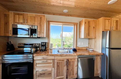 Island Overlook #1 is the first of three separate, identical cabins situated on a hillside overlooking Lake Superior. These newly constructed cabins feature all of the comforts of home while boasting an unforgettable view of the Apostle Islands National Lakeshore, particularly Raspberry Island. In each cabin, you’ll walk into an open-concept living room and kitchen with panoramic windows and a sliding glass door to the private back patio. The living space is equipped with a Roku Smart TV and DVD player, as well as a queen sleeper sofa. Enjoy the view from the fully-stocked, modern kitchen. The cozy, quiet bedroom features a queen bed and modern ceiling fan/light combo. The spacious bathroom has a large walk-in shower! Head outside to utilize your cabin’s private patio furniture, grill, and fire pit. *Guests may use outdoor fire pit but are required to purchase their own firewood locally.* All linens, towels, and basic toiletries provided. Beach towels NOT provided. Kitchen stocked with essential cooking equipment and standard drip coffee maker.