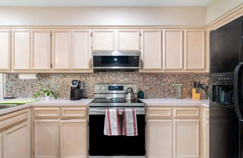 Guests will enter through the front door by using a digital keypad. Once inside, the dining room is to your left, and the living room is straight ahead. The dining room has a large table with seating for six. Continue through this space to enter the fully-equipped eat-in kitchen. A pub table with two chairs, three countertop barstools, ample counter space, essential cookware, and dinnerware completes this space.