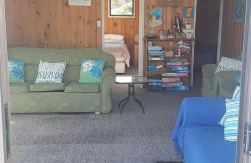 2 bedroom house with 2 out-cabins 1 minute walk to the beach. Air conditioner/heat pumps in main living room and master bedroom. All utensils, plates and cutlery provided. 40 inch flat screen t.v. DVD player and stereo. Laundry facilities. Fun house with beautiful sunny bbq deck. "Floating" walkway from main house to cabins. Close to boat launching and golf club. Ideal get away for families and friends or small social clubs. Great value as the bach will comfortably sleep 8.