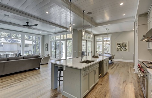 This 7-bedroom coastal beauty is just minutes away from the ocean and the perfect spot for your next island getaway! This home beams with beautiful furnishing and elevated features throughout the home. Indoors and out, this home exudes coastal charm. Warm wood tones for floors and furnishings blend beautifully with the pale gray walls, upscale finishes, and gorgeous paneled ceilings.