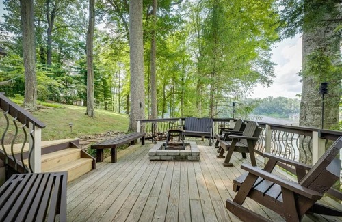 Beautiful 2 story lakefront retreat features 4 bedrooms, 4.5 baths, fully equipped kitchen, hardwood floors and nearly 180 degree lake views from almost every spot. A wood fire pit with starter wood, 2 kayaks, a canoe, paddles and life vests available for use. 4 decks at multiple levels make for perfect sunset watching and open space inside and out make this a perfect retreat for your family.