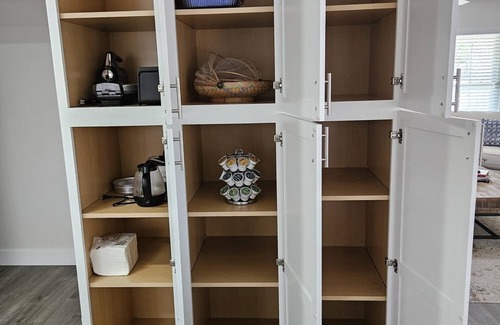 Fully stocked with everything that you will need for your stay. The dining area accommodates 8 with four dining chairs and four barstools for countertop seating. A fire extinguisher and first aid kit is available in the kitchen.