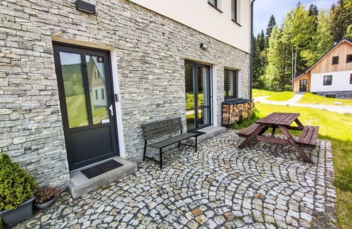 Comfortable cottage, 2 storeys, detached, built in 2023. Outside the resort, along the wooded area, 2 km from the skiing area. Private: property. Terrace. In Winter: please take snow chains. Parking. E-charging station. Shop 2 km, grocery 2.5 km, supermarket 6 km, shopping centre 20 km, restaurant 2 km, bus stop "Jiřetín pod Bukovou" 1.4 km, railway station "Jiřetín pod Bukovou" 1.3 km, outdoor swimming pool 7 km, indoor swimming pool 20 km. Golf course (9 hole) 17 km, walking paths from the house 10 m, cycle lane 100 m, ski lift 2 km, slopes 2 km, ski rental 2 km, ski school 2 km, cross country ski track 100 m, children's playground 3 km. Nearby attractions: Rozhledna Černá Studnice 6 km, Muzeum obrněné techniky Smržovka 6 km, Vodopády Jedlové 7 km, Kittelovo muzeum v Krásné 12 km, Aquapark Babylon, IQLandia, ZOO Liberec 22 km, Bozkovské jeskyně 22 km. Well-known ski regions can easily be reached: Tanvaldský Špičák 2 km, Filip Smržovka 4 km, Světlý Vrch Albrechtice 4 km, Josefův Důl 7 km, Severák, Bedřichov 12 km. Hiking paths: Hřebenovka.