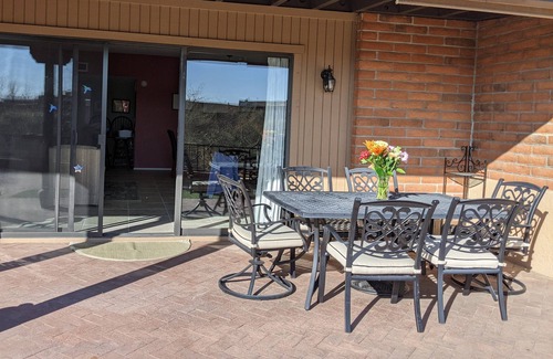 This spacious 1650 sq. ft 2BR, 2BA home in the small, friendly 55+ Canoa Vistas community sleeps 6 with use of the queen pull-out sleep sofa. Wake up to chirping birds (we call it the Dovecote for a reason!), mountain views and a 5-minute walk to Canoa Hills Recreation Center (one of 8 Green Valley Recreation-GVR- centers available to everyone) for a fitness center, tennis, bocce, heated pool and spa. You also have quick access to over 5 miles of walking trails that are great for exercise, birding and wildlife watching. With 2 patios and another seating arrangement out front, you get to choose sun or shade for relaxing, morning coffee (Keurig or 12-cup Cuisinart Grind and Brew coffeemaker), cocktail hour, meals cooked over the Weber propane gas grill or in the well-equipped eat-in kitchen with gas stove with griddle insert. More "formal" dining for 6 is around the corner in the Great Room and on the patio under a lighted ceiling fan.