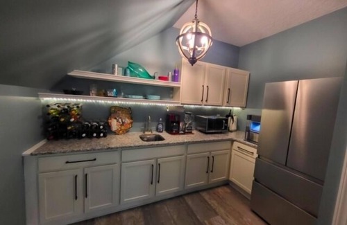 3 levels, each with its own kitchen. 10 Roku tvs throughout house and at SwimSpa. 2 laundry rooms. Pool table and card table upstairs in rec room. 17 ft SwimSpa on lower level which can be heated or cooled along with sun loungers. Wifi internet. Spacious rooms and plenty of living room space for everyone in your group. Kitchens have all amenities you will need during your stay. Bed linens and towels CAN be provided with an additional $250.00.
