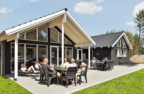 Holiday cottage located in a very scenic area. The house has modern furnishings, is very spacious and well-dimensioned and has 3 separate sleeping areas. Each sleeping area has its own bathroom and there is also a bathroom adjacent to the pool area. 2 spacious mezzanines. The living/dining area is tastefully furnished with a stereo set system with CD player, TV, DVD player, high chair, sofa area and a wood-burning stove. In the activity room you can play table football, billiards, electronic darts and table tennis. There are several TVs and a PlayStation and DVD player. The house is heated through geothermal heating. The pool area has a large pool, slide, large built-in whirlpool and a sauna. The pool is 18 m² and has a slide for the children. There is a swim coach which helps you improve your shape with daily strokes. Due to the size of the house the price for final cleaning on this Skanlux cottage deviates from the standard listed price. Payment for consumption, cleaning and deposit must be paid in cash to the concierge at the house. No letting to youth groups.