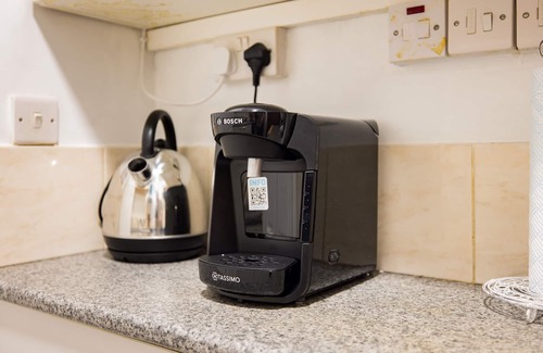 Feeling a bit peckish, you head to the fully-equipped kitchen. Sleek countertops and stainless steel appliances invite you to prepare anything from a snack to a gourmet meal. You brew a cup of coffee using the Tassimo coffee maker, savouring the rich aroma that fills the room.