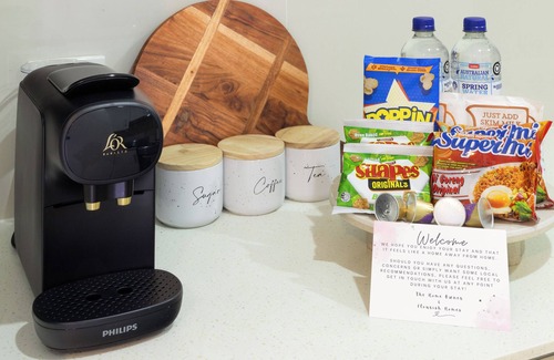 - Welcome Pack:2 Coffee pods, 4 coffee sticks, bottled water, and basic snacks (per bedroom). Please note that milk is not provided, however coffee creamer is available.