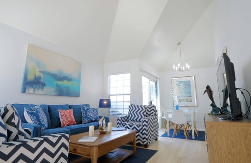 The living room has one large NEW LazyBoy sleeper sofa that sleeps two. The dining room seats 6, and a charming private patio is great for morning coffee, afternoon cocktails, or dinner, and includes a gas-fired grill.