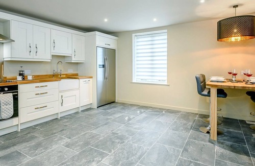 Kitchen area: Farmhouse style with electric oven, induction hob, microwave, fridge, freezer and dishwasher.