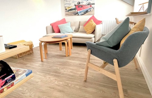 Shower Room: Cubicle Shower, Heated Towel Rail, Toilet. Electric Smart radiators, electricity, bed linen, towels and Wi-Fi included.. Public car park, £11.50 per week Easter-Oct, 200 yards. No smoking.. Aptly named, Seascape will have you enthralled with its bird’s eye view of New Quay harbour, the beach, and the breathtaking views across Cardigan Bay. With a drink in hand and watching the boats bobbing about, it’s hard to think of a better place to be! You may even spot the resident bottlenose dolphins that are so frequently seen in this part of Cardigan Bay. From the full-height windows found in the sleek kitchen/dining room, light floods into this third floor contemporary apartment, which benefits from an open-plan living space. Seascape is very well situated, and you will find an array of little shops, cafes, restaurants and pubs almost on the doorstep. Being by the sea, there are plenty of seafood options, but enjoying fish and chips or an ice cream is a wondeful, casual al fresco option whilst perched on the harbour wall! There are boat trips if you want to get closer to see the marine life, and from the sea you can really appreciate how the town clings to the rocks, as well as admire the long, sandy beach of Cei Bach. It’s not hard to understand why poet Dylan Thomas found this place such an inspiration for his creativity whilst he lived here.