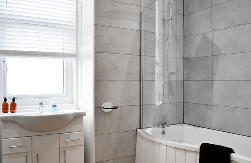 Bathroom: Bath With Shower Over, Toilet. Gas central heating, electricity, bed linen, towels and Wi-Fi included. Welcome pack. On road parking. No smoking. . Welcome to this exquisite second-floor retreat overlooking the bustling Main Street of Prestwick, nestled along the enchanting Ayrshire Coast. This charming holiday let offers an unparalleled experience in comfort and convenience. Upon entering, guests are greeted by a beautifully decorated interior, boasting spacious rooms with high ceilings and large picture windows that flood the space with natural light. The open-plan living, dinin and kitchen area invites relaxation and socialisation, complete with a large screen TV, plush seating, and a well-equipped kitchen ready for culinary adventures. The bedrooms, adorned in warm hues, offer havens of tranquillity with sumptuous beds with crisp linen, ensuring a restful night’s sleep. The sleek and modern bathroom adds a touch of luxury to your stay.