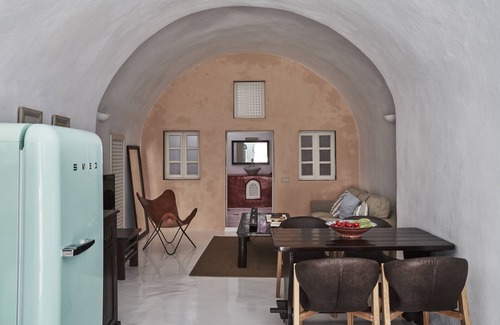 Located under the church of Agios Anargyros with its wonderful bell tower, the two bedroom Villa Ivi is a charming retreat from the hustle and bustle of Fira and Oia. Sheltered from the Cycladic winds, the traffic free village of Megalochori provides a peaceful and sought-after alternative. The romantic Villa Ivi once provided the villagers with a safe haven from marauding pirates who invaded the island. Today the villa, with its cool vaulted interior, provides an enchanting holiday home.