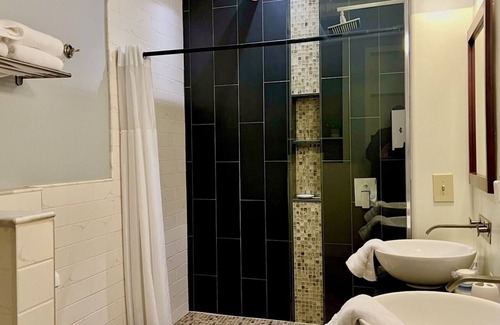 1400-square foot upper floor loft apartment located in a historic building serviced by elevator in the middle of Downtown Medina. Tall ceilings, gleaming vintage wood floors, and huge windows will great you as you enter the open-format living space. Industrial design cues throughout remind of the buildings use as a factory. The living area can seat 8 comfortably and opens onto the dining area and kitchen with quartz counters and stainless steel appliances. Down a hallway is the main full bath featuring soaking tub and oversized tiled shower with rainfall showerhead. At end of hall are two private bedrooms, one with a king bed, and the other a queen.