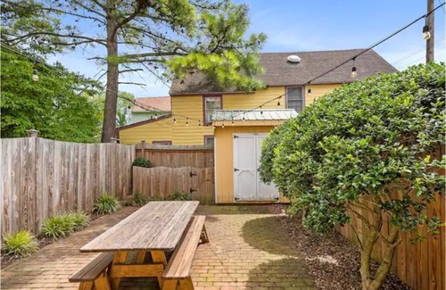 - Brick patio with string lights and 7 foot picnic table for your next crab feast