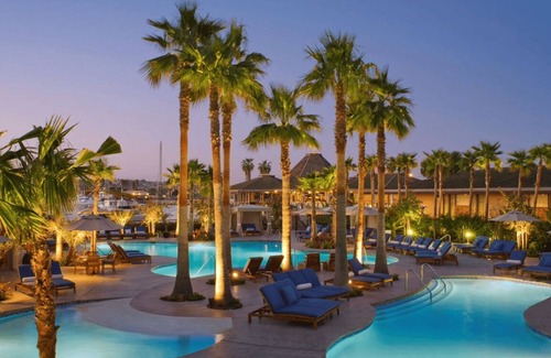 Enjoy the soothing tones of boats gently rocking from the terrace of the Marina View Corner Suite. The soft, soothing decor of this upscale one-bedroom suite in San Diego, California is accented with bright, nautical blues and crisp greens. The spacious bedroom and separate sitting area offer beautiful panoramic views from floor-to-ceiling windows. The modernly appointed bath of this corner suite features spa-inspired provisions and a walk-in shower. A calm, relaxing getaway awaits when you stay in this expansive seaside corner suite. The Hyatt Regency Mission Bay Spa and Marina boasts an impressive San Diego resort. Famed as the only hotel in the city to provide a full-service marina with sailboats, sport fishing, kayaks, jet skis and whale excursions. Expect a wonderful waterfront retreat with onsite dining options by the bay, an eco-friendly spa, and three pools with inviting lounges. The well-appointed suites offer premium bedding, private balconies and expansive living areas. Easily accessible for major attractions nearby, this resort proves itself as a fantastic base for a memorable San Diego vacation.