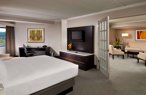 Stay in the heart of downtown Albany while enjoying 650 square feet of space to stretch out in when you stay in a 1 King Bed Suite. Entertain guests or unwind after a busy day in the stylish living room, which features a sleeper sofa. Close the frosted French doors to provide privacy to the spacious bedroom, which is furnished with a King-size Hilton Serenity bed, or leave them open to create a flowing open floor plan. Located within walking distance of the New York State Capitol Building, the hotel ensures your next visit to Albany a breeze with a shuttle service to Albany International Airport and Amtrak station, as well as on-site car rental. Savor delicious American cuisine at the Charter Restaurant, or enjoy a selection of local brews and handcrafted cocktails until 1:00 am at Sessions Lounge. Swim laps in the heated indoor pool, or squeeze in a workout using the fitness center's free weights and cardio machines. Get some work done at the 24-hour Connectivity Station, or relax in peace on a Quiet Zone floor. For meetings and conferences, hotel boasts 31 meeting rooms with over 30,000 square feet of meeting space.