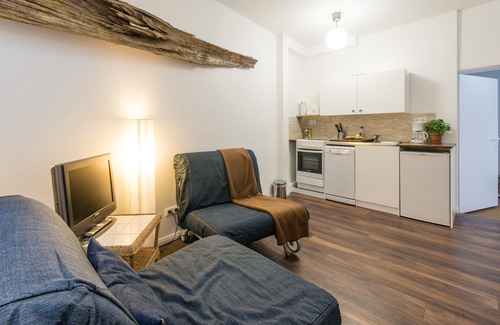 Located in a quiet courtyard separating it from the main building, this former little workshop with its own entrance and stairway holds a secluded, two-story apartment. On the ground floor you'll find a small living room with a kitchenette and two single sleeping couches. Following a small winding staircase into the basement, you'll get to a bathroom with a shower plus a separate toilet as well as the main bedroom with a queen size. This setup makes the apartment a perfect retreat for up to four persons. Street parking is free, Wi-Fi included.