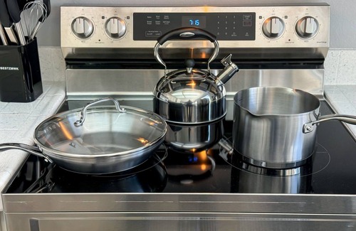- Kitchen with stove top, Stainless Steel Toaster Oven with Broiler, oven, microwave, refrigerator