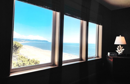 Newly constructed home with 2 identical master suites upper level, each with king beds overlooking the ocean, and private baths including walk -in showers with pebble floors and granite counters. One has lcd TV. The main level has expansive glass viewing miles of beach and ocean, a 17foot section of glass folds open to a large partially covered deck on mild days. Polished black concrete floors contrast with natural fir wood and leather furniture. Relax taking in the view while warming by the gas fireplace. The lower level has a large lcd tv with hi definition cable service in the family room flanked by 2 bedrooms with queen beds, ocean views and baths. Off the family room is a large deck with a gas grill, lounge chairs, and a 7person hot tub. Relax in the tub and enjoy the ocean views and sounds. The garage has a game table pingpong table and also large windows south to the ocean view. Wifi available.