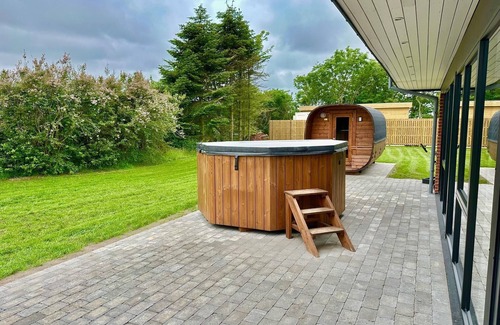 This charming house features a brand new luxurious wilderness hot tub/Jacuzzi with lights and bubbles, accommodating 14-16 people. Additionally, there is a huge, newly built sauna barrel with room for 12-14 people, perfect for relaxation and comfort.