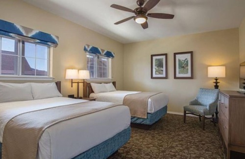Branson at the Meadows resort is nestled in the hills and has many buildings. The 2-Bedroom Deluxe unit is approximately 1,180 sq. ft. You will have a full kitchen, living room with a queen sleeper sofa, dining room, master bedroom with a king-size bed and private bathroom, a second bedroom with two double beds, full main bathroom, and a porch. Unit will be assigned at check-in and may vary in layout and view. There is an activity center with an indoor and outdoor pool, hot tub, and play area for both children and adults, complete with shuffleboard!
