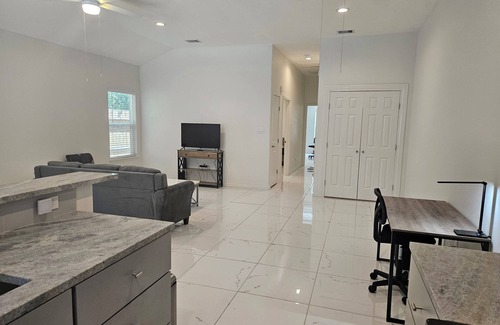 Enjoy the fresh, modern feel of this newly built home, close to everything. The bright, open-concept space boasts marble floors, 10-ft ceilings, and contemporary furnishings. A fully equipped kitchen, comfy queen beds, walk-in glass showers, and in-unit laundry provide all the comforts of home. Stay connected with WiFi, two smart TVs, and a dedicated workspace. Plus, enjoy private outdoor space, air conditioning, ceiling fans, and on-site parking for two cars—your perfect retreat awaits!