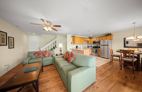 Your stay includes a spacious two-story condo with a private downstairs entrance. The main bedroom features a king bed, the guest room offers two full beds—ideal for families or small groups—and a sleeper sofa in the living area provides extra room to relax or host additional guests. A fully equipped kitchen and open dining area make mealtime easy and comfortable.