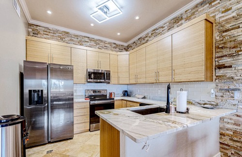 As you enter this air-conditioned home away from home, you will be greeted by a beautifully decorated open floor plan that effortlessly combines all living spaces into one. The living room is all about relaxation and entertainment with inviting furniture and a smart TV with streaming services so you don't have to miss out on your favorite series while on vacation. It also features an electric fireplace for colder days. The kitchen has been appointed with modern appliances that will make cooking a breeze, including a dishwasher for easy and quick post-meal cleanups. The condo provides you with a front patio with seating and a washer/dryer on-site.