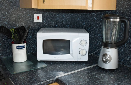 The kitchen has a large fridge freezer, washing machine, microwave, oven, hob and toaster. There is an outside clothes line, iron and ironing board.