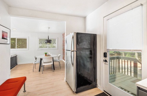 Inside, the brightly lit main level offers a cozy, fully equipped kitchen stocked with all the basics for easy meal preparation and a spacious dining area and living area with easy access to the large deck through the sliding glass doors. The living area offers a wall mounted Smart TV, electric fireplace and views of the backyard and surrounding woods. On the main level you will also find the full bathroom with a bathtub and shower as well as one of the bedrooms offering a day bed with two twin size beds along with the stackable Washer and Dryer. The upper level offers two additional bedrooms. The main bedroom provides a Full size bed, private half bathroom and work space. The second bedroom offers two full beds and access to the balcony. In home comforts include central air conditioning, free Wi-Fi, washer/dryer, dishwasher, and electric fireplace.