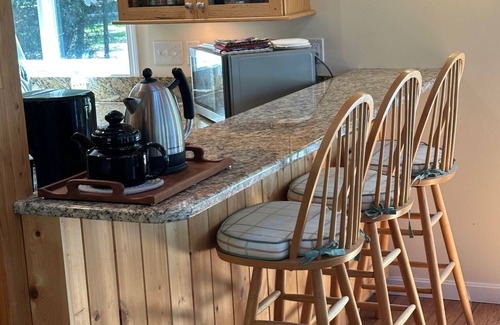 This 8-year-old single family home of post-and-beam construction, with vaulted ceilings and open floor plan is perfect for your multigenerational family vacation. When not sampling the local restaurants, enjoy preparing meals in the modern kitchen with an abundance of light and views of nature and the lake. Granite countertops, stainless steel appliances, and oak cabinets and flooring are warm and welcoming. The dining area hosts a large, expandable cherry table to seat 8 guests, as well as countertop seating. The loft space overlooking the living room has a large desk for wi-fi-based remote business work. Ceiling fans are located throughout the home and a Jotul propane stove quickly addresses any chilly evenings.