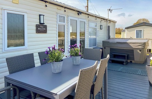 The bubbling hot tub awaiting your arrival, lovely view from the rear, perfect to spend time with friends or family close to the beautiful coast.. 8 steps to entrance.