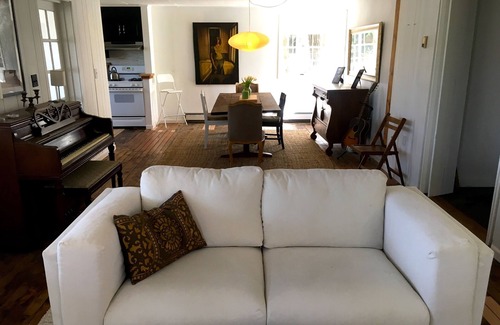NOTE We have no ratings or reviews because this is the first time we are renting our home. There are only 4 homes on this lake that rent during the year. It is a very special place. Newly renovated inside and out, country farm house sits on a hilltop with 2.5 acres, overlooking a 7 acre swimming lake. It is a 5-minute walk, on a private road , to your dock where you can swim to your hearts content, fish, paddle, etc. Lake is shared with four homes in a community. This community and lake are up a private road. Surrounded by a ridge of small mountains. Unless you live here, no one knows about the lake even though you are minutes from Rhinebeck, Red Hook, Hyde Park, Hudson, Omega Center etc. Also, unlike most other lakes in NY state, there are no car roads on any side of the immediate lake, so the effect is that you are far away from daily life. But if you crave an upscale dinner, movies, gallery, spa, pilates, it is all a 12 minute drive. We are in the town of Rhinebeck. Inside the house is hard wood floors, white walls, golds and warm tones throughout house. A 4 season porch, lets all the sun in but keeps out rain, great for breakfast, lunch, dinner, yoga, writing a novel or taking a nap. Incredible views and incredible light from sunrise to sunset through whole house. Also great stargazing from many different rooms, as well as your own yard to sit in and enjoy watching the shooting stars! Three private bedrooms, in tune upright piano, and a few guitars, living room , dining rooms, one seats 10 the other seats 6, very full service kitchen. Views of lake and forest out living room, dining room, kitchen and views of forest and our barn out all other windows in home. Located on a private road, this is a safe, quiet, glorious location. Deer, wild turkeys out your window. Crickets, frogs, eagles and geese around the lake. Outside the house are two yards. One sits in front over looking that lake, though in summer it is hard to see only cause of the amazing trees. The other outdoor space for BBQ, dinner or drinks is on the south west side of house. Home is on it's own 2.3 acres. Lake- Private swimming dock, no motorboats, second cleanest lake in NY State, Spring fed lake, glacier lake, canoe and paddleboard available. Water is warm enough for evening moon swims or rows starting mid July. Day swims start mid June. Note alot of lake homes do not have water that has been cleared of lily ponds. This has. You can swim to your hearts content