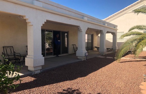 Beautiful 3 bedroom lake front home in a gated community. This home includes two master bedrooms (with walk in closets.) plus a third bedroom with bunk beds. All rooms include fans and central air. If fishing is of interest, the home also has a private dock to the man made lake. For boaters, the community includes a private launch ramp to the Colorado River. The home also includes Internet and WiFi throughout the home.