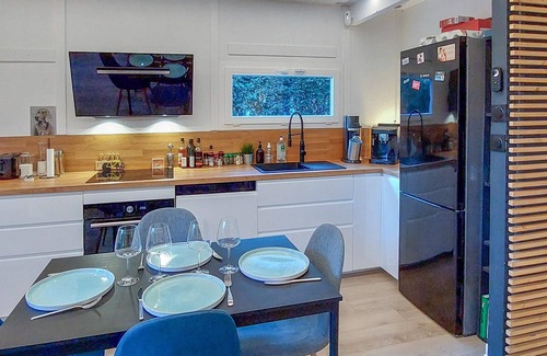 This cosy wooden chalet is located in the immediate vicinity of the picturesque lake of Hourtin and the charming harbour. With a gallery in the living room and comfortable furnishings, it offers the perfect retreat for a relaxing holiday. The bright atmosphere and loving design invite you to feel at home. Spend time together in the well-equipped kitchen or enjoy sunny hours on the terrace. The neighbourhood is ideal for families, as there are numerous play areas for children nearby.
