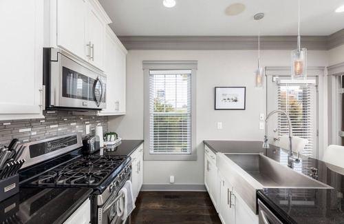 This upscale 3BR/3.5BA townhouse located in Nashville across the street from Belmont University is a short distance from Music Row, Hillsboro Village, 12 South and Vanderbilt University. The Gulch and all that downtown has to offer is 5 minutes away. Built in 2014 this stylish, three level townhouse is newly furnished. This home has a large living area with a 65" TV, a large comfortable sofa, love seat, and marble coffee and side tables. The dining table seats 6 or dine at the black quartzite kitchen island that seats up to 3 people. The fully stocked gourmet kitchen has stainless steel appliances and gourmet cookware. Upstairs there are two large, beautifully decorated bedrooms with King Beds, well appointed private baths, and walk in closets. Each upstairs room has its own desk and a 55" TV and in the hallway is a stackable washer and dryer for your convenience. The third bedroom is located on the bottom floor and is also furnished with a King Bed, private bath and 55" TV. An additional stackable washer and dryer is located nearby the bottom bedroom just outside the garage entrance. You will find gorgeous, dark wood floors throughout the townhouse and feel right at home with the cozy, modern decor. Outside of the garage is a stone fireplace to warm you up. Private off street garage parking. High speed internet & cable TV. STAIRS between all floors. No elevator.