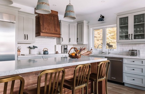 The lower level has a well-designed bathroom that is shared by the double bunk room for the kids and a fourth king suite with lake view. A wood burning stove and heated flooring throughout the lower level keeps you nice and toasty on cold winter days. Enjoy some after dinner cocktails at Mossrock Tavern, your own private bar with granite counters, 60-inch TV, leather sofa and a raised bar top that's perfect for playing bartender!