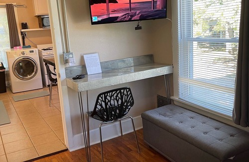 Completely Renovated 2 bdrm, 1 bath just off Hwy exit. 700 sq ft with wood floors. 2 new queen beds & bedding. New counter tops, tables & filtered drinking water. Custom made murphy bed is the highlight of the main room as it looks like a large piece of marble. Each room has a big screen tv with roku. Unit is a duplex with parking directly in front of unit. Covered porch.Large bathroom with washer & dryer. Large kitchen as well. This unit is a upper unit that has about 14 stairs. Great quiet neighborhood. There is a park directly across the street for walking or if you have a pet. Pet fee $25 per pet. NO parties at this residence!! Serious inquiries only!