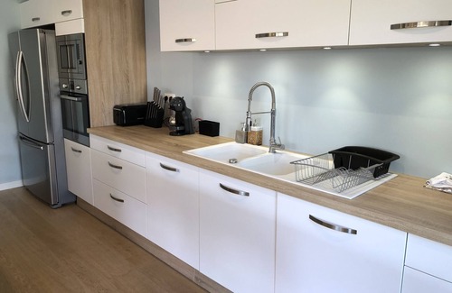 The kitchen is fully equipped with American fridge (fresh water, ice and crushed ice), dishwasher, oven, microwave, toaster, Dolce Gusto coffee maker, raclette machine, blender, induction hob, hood...