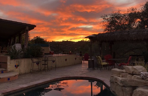 When it's time to unwind, you can soak in the outdoor pool, hop into the hot tub with sunset views, relax in the Palupa, or cozy up by the fireplace with a good book. Stay connected with the free WiFi, or challenge your friends to a game of pool in the covered patio room. The property offers a dedicated workspace with a desk, chair, and printer for those needing to stay productive.