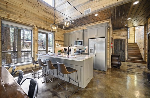 A large open floor concept flows between the kitchen, dining and living room making this cabin perfect for entertaining. Our fully stocked kitchen provides plenty of space to cook a delicious meal. Pruitt's' is the best stocked store in Hochatown, which is located north of Broken Bow. We keep the everyday necessities around such as coffee, sugar, creamer, pots/pans, utensils, seasonings, oil, along with plenty of other items you may need to prepare your meals. We provide dishwashing detergent, dish soap, hand soap, sponges, trash bags, and a few rolls of paper towels and toilet paper in each bathroom to get you started. Our washer and dryer are located in a hall closet close to the kitchen.