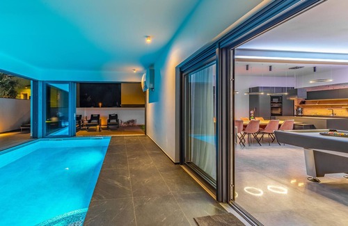 Spend your holiday in this luxurious villa in Fazana, which will impress you with its elegant design and high-quality furnishings. The open-plan living area on the ground floor offers you plenty of space to spend time together, whether cooking in the spacious kitchen or playing a game of pool. Upstairs you will find private bedrooms with en-suite bathrooms, some with access to the large terrace, which is ideal for relaxing yoga exercises in the morning sun. Relax in the heated indoor pool, enjoy the sauna or linger on the sun loungers on the spacious terrace.