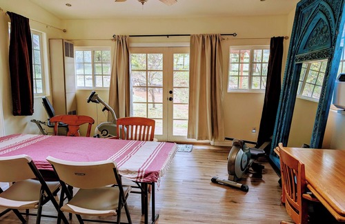 Your cozy getaway awaits in Santa Ysabel at this serene cabin. With 4 bedrooms including 1 queen bed, 2 twin beds, and 1 full bed, this peaceful retreat offers a relaxing escape. Enjoy the convenience of amenities like heating, AC, WiFi, playground, and a small fitness / gym room. Three bathrooms with a hair dryer ensure comfort for all guests. The fireplace is currently not working. One of the bedrooms doesn't have a standard wall; it has a curtain. The house is completely private but the ten acres is shared with others and it is not private. There are two private patios. There is a path that goes around the property that our Guests enjoy. There is also a walking labyrinth that our Guests also enjoy. We'll be available to answer any questions while you stay at our place.
