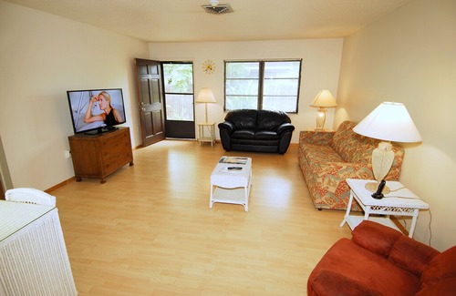 Tangerine Terrace is a spacious and quiet vacation rental located off the road behind our other property (vrbo#19396) where we have been proudly serving guests since 2003. Our guests return again and again to enjoy our clean, quiet, safe and comfortable accommodations in a great location that is just 1/2 mile to Nokomis Beach. You can get there via a 10 minute walk on the sidewalk or you can take your car to the beach parking lot which is always free and rarely crowded. Put the address into Google Maps or Mapquest to see the exact location of this property: 403 Shore Road, Nokomis, FL 34275. Please scroll down to see all our photos and information. This spacious and quiet villa, located in our Tangerine Terrace duplex, is thoughtfully outfitted for your maximum vacation enjoyment. Your home away from home is tastefully appointed, approximately 1100 square feet with an additional 300 square foot lanai, recently remodeled, non-smoking, and has three bedrooms, two baths, living room, eat in kitchen, and a spacious screened lanai. In addition to the fabulous location in a beach neighborhood just a 10 minute walk by sidewalk from your villa to Nokomis Beach, we offer excellent amenities: - Free High Speed Internet via wireless Wi-Fi connection. - Linens, towels, dishes, pots, pans & utensils provided. Everything you need. - Luxurious high flow Speakman shower heads with LOTS of water pressure and plenty of hot water. - 46' Samsung LED HD flat screen TV in the living room. - 27'' TV in the master bedroom. - The master bedroom and 2nd Bedroom have a queen bed in each. The 3rd Bedroom has two twin beds. - Your own washer and dryer in the unit. - Modern state of the art central air and heat. Fully-equipped with all amenities: dishwasher, smooth top range, coffee maker, toaster, microwave, stainless steel pots & pans, dinnerware, etc. Pets are allowed with prior permission. We are pet friendly but do not surprise us with your pets. UNIQUE AND FUN THINGS TO DO IN THIS TROPICAL VACATION PARADISE: We provide a great guest binder in the villa with information about activities and with menus from the great local restaurants. - Visit the world famous Venice Audubon Rookery where herons, egrets and other birds nest. 8 miles away, free. Peak Season is Winter/Spring. Google 'Venice Audubon Rookery' - Scuba Dive off of Venice Beach for fossil sharks' teeth including huge Megalodon teeth and other fossils. You can go right in from the shore. 4 miles away. Or go out on a Florida West Scuba School charter boat that will put you right on the best spots. You can also get quickly certified and do your training dives right from the beach where the sharks' teeth are. Visibility is best in April, May & June but divers go year round. Google 'Florida West Scuba School' -- Enjoy the drum circles at Nokomis Beach every Wednesday and Saturday 1 hour before Sunset. 1/2 mile away. Google 'Nokomis Beach Drum Circle' -- Go Kayaking with any of several local outfitters. Take a tour, a class, rent a kayak or go to a free kayak demonstration day to try paddling many models for free. You can also rent Kayaks and Canoes at Myakka River State Park and canoes at Oscar Scherer State Park mentioned below. Google 'economy tackle kayak' or 'grande tours placida' -- Visit Myakka River State Park and walk thru the tree tops on one of the world's few canopy walks. They also have tours on the world's largest airboat for up close views of alligators and other wildlife (airboat tour is $10) 20 miles away. Admission to the State Park is $5 per carload. Google 'Myakka River State Park' -- Ride a bicycle or walk along our newly completed trails: the Venetian Waterway Park in Venice (10 miles of paved trail along both sides of the intercoastal waterway) and the 12 Mile Legacy Trial from Venice to Sarasota. A trailhead is less than 2 miles away. Google 'Sarasota Legacy Trail' and 'Venetian Waterway Park' -- Great Fishing and Golfing is plentiful and well known to those who enjoy those sports. The Venice Jetty Fish Camp (1.5 miles away) sells live bait shrimp before dawn to those wishing to fish early. -- See the threatened Florida Scrub Jay in the wild at Oscar Scherer State Park, just 3 1/2 miles away. You are virtually guaranteed to see them if you go on the ranger led nature walk at 8:30am Sundays January thru March. Other walks are at 8am Thursdays, 8:30am Fridays and there are guided canoe tours Wednesdays at 8:30am. Google 'Oscar Scherer State Park' -- Eat Grouper sandwiches and other great local seafood at Pelican Alley, Pop's Sunset Grill, Captain Eddie's and Briandi's, all less than 3 miles from your front door. -- Visit Mote Marine Aquarium in Sarasota and learn about the sea turtles that nest on Nokomis Beach and other area beaches from May to October. 20 miles away. Google 'Mote Marine' -- Explore the area beaches in addition to the one down the street. You can find fossil shark's teeth on the beach at Caspersen in Venice and see the spectacular and famous white sand of Siesta Beach in Sarasota. Google 'Sarasota County Beaches'
