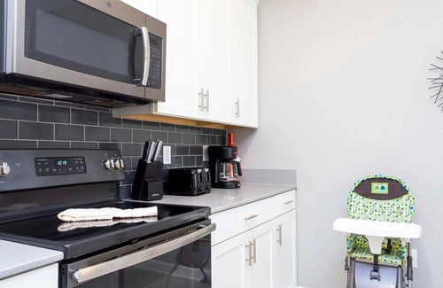 Step into a warm and welcoming open-concept living area, where stylish décor, neutral tones, and natural light create an inviting atmosphere. The spacious lounge features comfortable seating and a large smart TV, perfect for movie nights or relaxing after a day at the parks. Adjacent to the living room, the fully equipped kitchen includes modern stainless steel appliances, granite countertops, and all the cookware and utensils you’ll need to prepare anything from quick breakfasts to family dinners. The dining area comfortably accommodates your group, offering the perfect setting for shared meals and meaningful conversations.