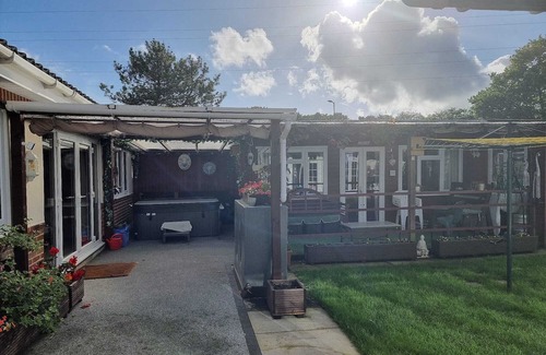 Beautiful , large Garden with six seater enclosed hot tub, separate children's play/games room including pool table and dart board, fantastic brick built BBQ area with wrap around seating and