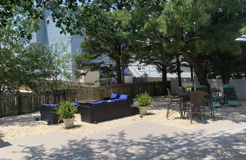Recently renovated Cape Style 5 bedroom, 3 full bath, with new kitchen, open vaulted family living area, new large sprawling deck, new outdoor shower with changing area. This home is 2 short blocks to the beach and is 4th house from the bay. Bay views from the front porch. Sleeps 24 comfortably. 3 bedrooms have 2 queen beds. 1 bedroom has 2 sets of double bunks. First floor bedroom with queen. Family room with queen sofa pull out. Hardwood floors throughout. Brand new HVAC, no pets, spotless home. High grade air filtration system. Very low allergen home. Kitchen is new with stainless appliances. Commercial ice maker available for use in the garage. The house is very close to the LBI Hotel and other LBI wedding venues. Ideal home to rent for wedding guests! Just added an entertainment bar area in the garage called the “bar-age” with new 2 tap kegerator! This is a must rent place in beautiful Surf City!